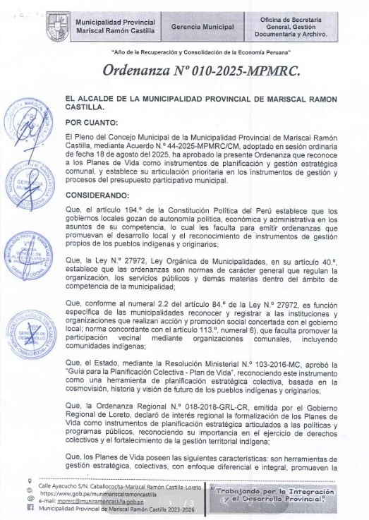 Caballococha, Loreto – El pasado 18 de agosto de 2025, la Municipalidad Provincial de Mariscal Ramón Castilla aprobó la Ordenanza Municipal N°010-2025-MPMRC, que reconoce a los Planes de Vida como instrumentos de gestión estratégica comunal y establece su articulación con el Presupuesto Participativo, Programa Multianual de Inversiones, y otros, para que los proyectos de inversión pública local respondan a las necesidades reales de la población.
